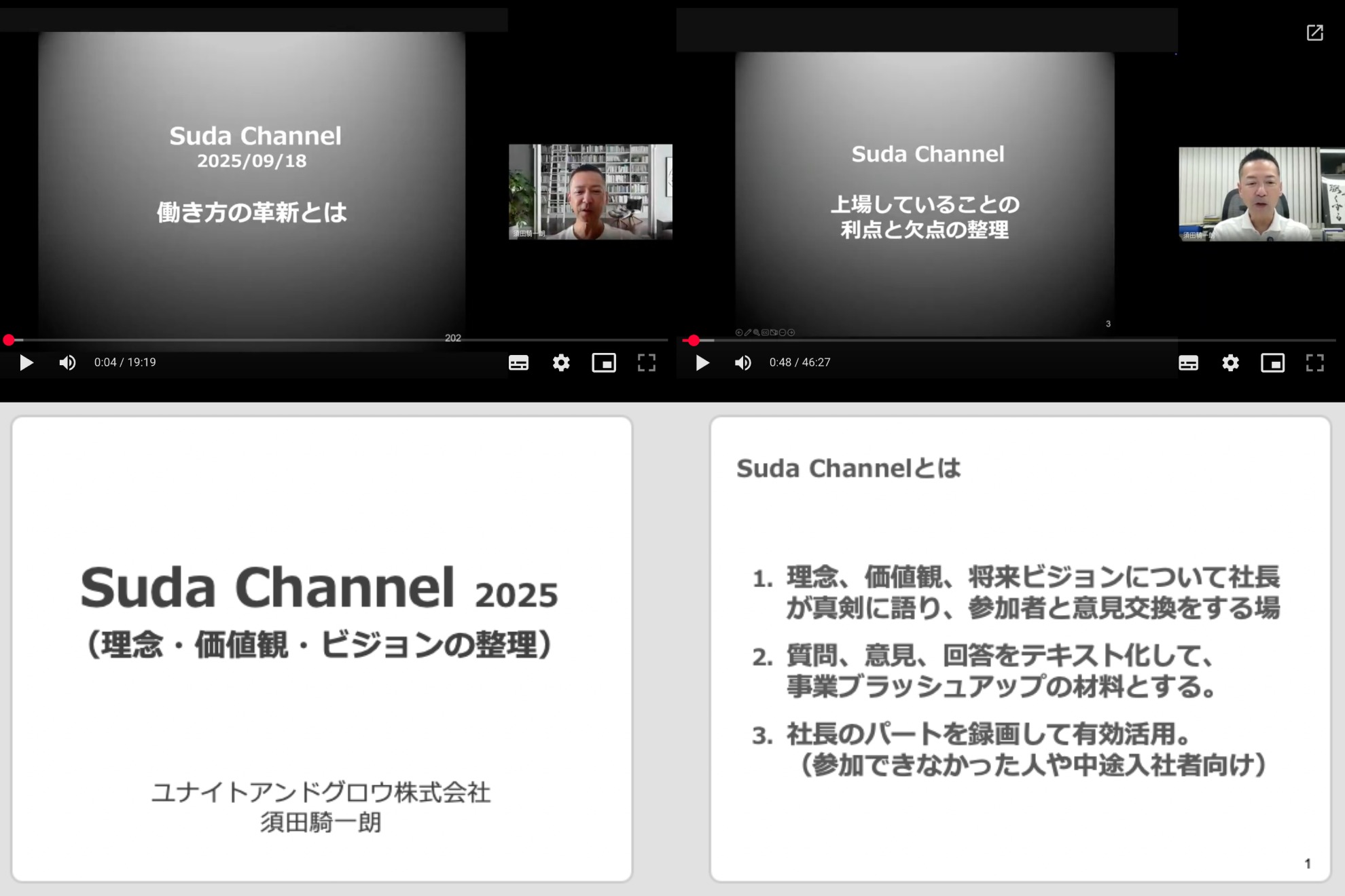最近は社員数が300名を超えたこともあって、やり方を少し変えました。少人数で開催したものをビデオに撮り、後から誰でも閲覧できる形式を併用。これを「Suda Channel」として、ビデオシリーズ化が進展中です。