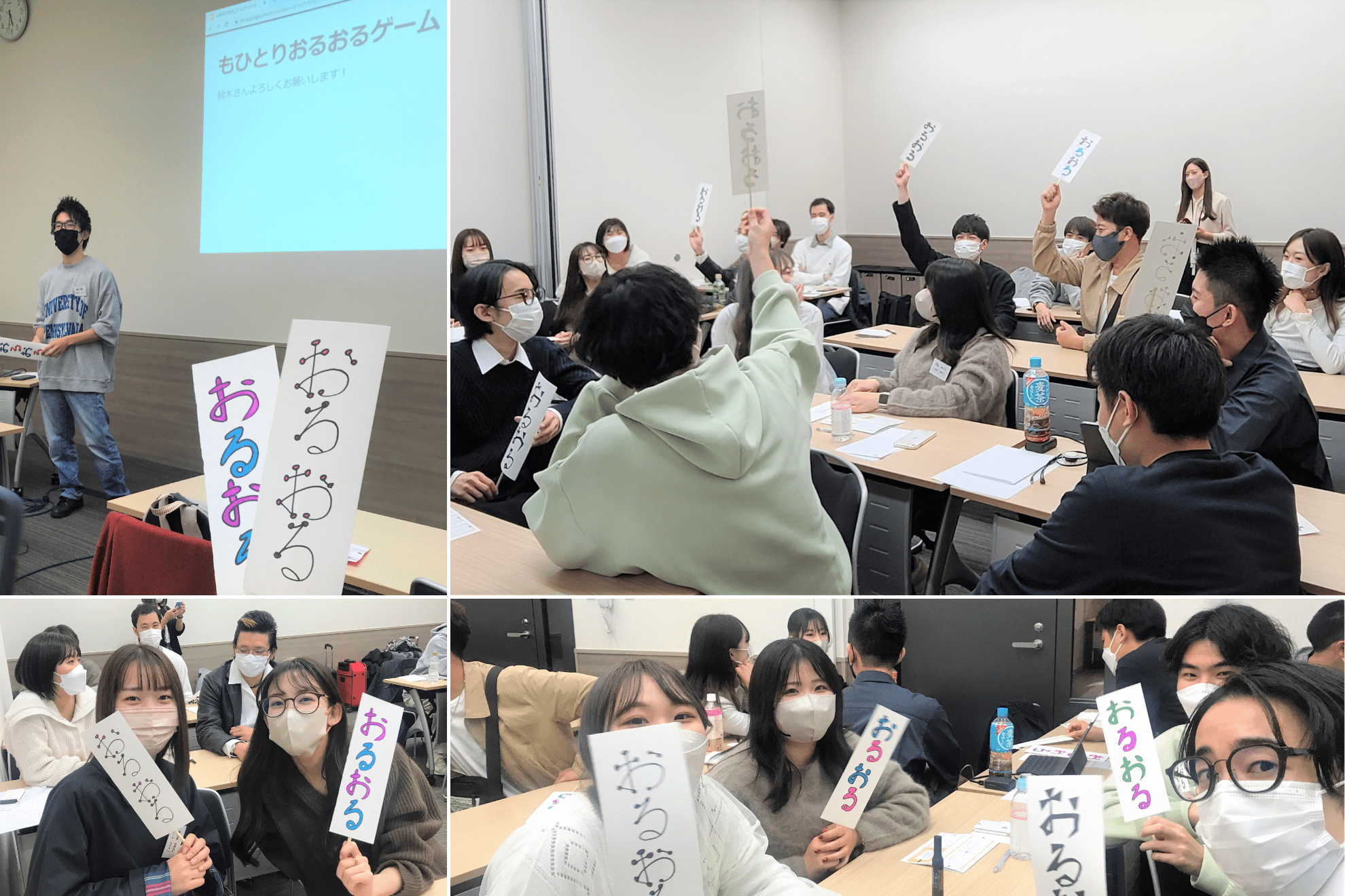 「もひとりおるおるゲーム」は、参加者のなかから自分ともうひとりだけ共通しそうなことを発表し、自分も当てはまる!という場合に「おるおる札」を挙げるゲームです。見事、「おるおる札」を挙げたのが自分ともうひとりだけだったとき、1点獲得できます。