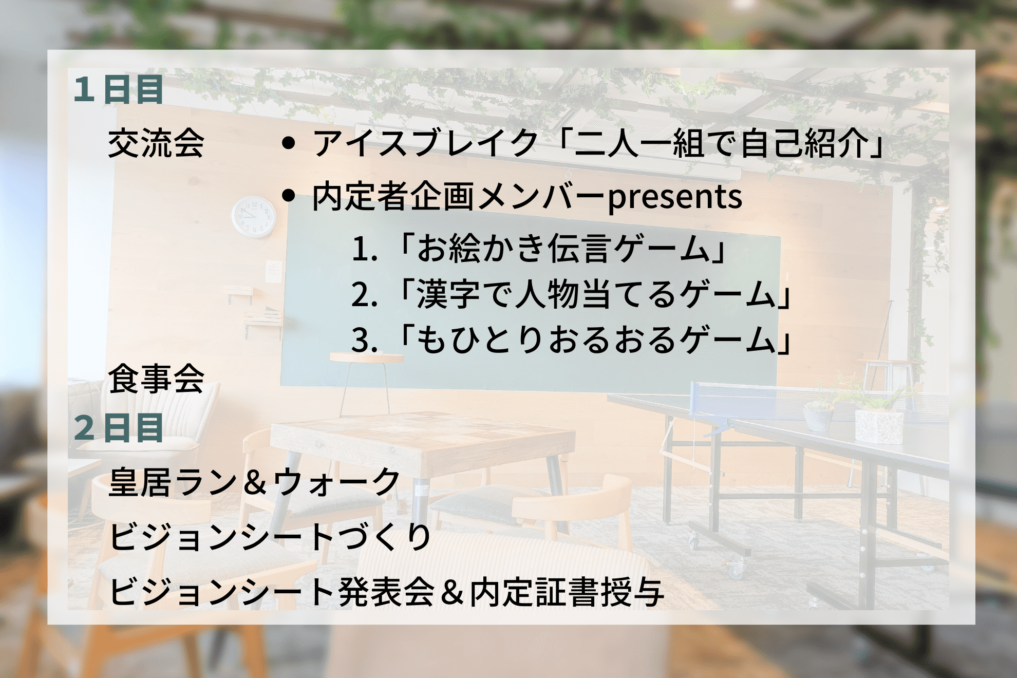 また準備を進めるなかで、主役である内定者とともに企画したいということで、内定式づくりに企画から関わりたいメンバーの募集もしました。そこで立候補してくれた4名にコンテンツの企画や準備、運営をお願いすることにし、結果として、このようなプログラムで開催しました!