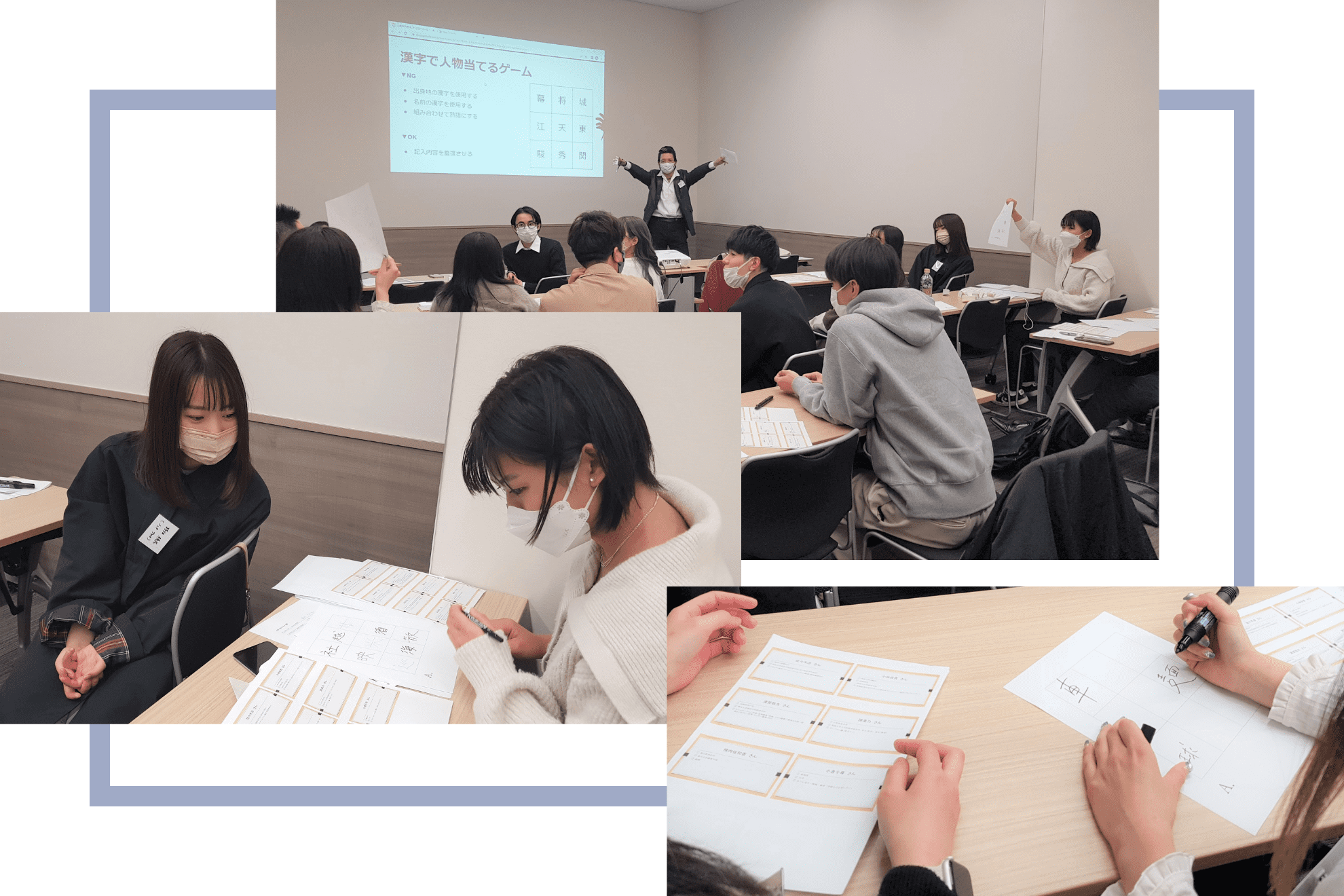 「漢字で人物当てるゲーム」は、参加者のなかからルーレットで選ばれた人を漢字9文字で表し、回答者が当てるというゲームです。これまでの自己紹介などを参考に漢字をチョイスしてヒントをつくっていきます。なんと、全チーム全問正解という結果に終わり、参加者の的確なワードチョイスに脱帽しました。