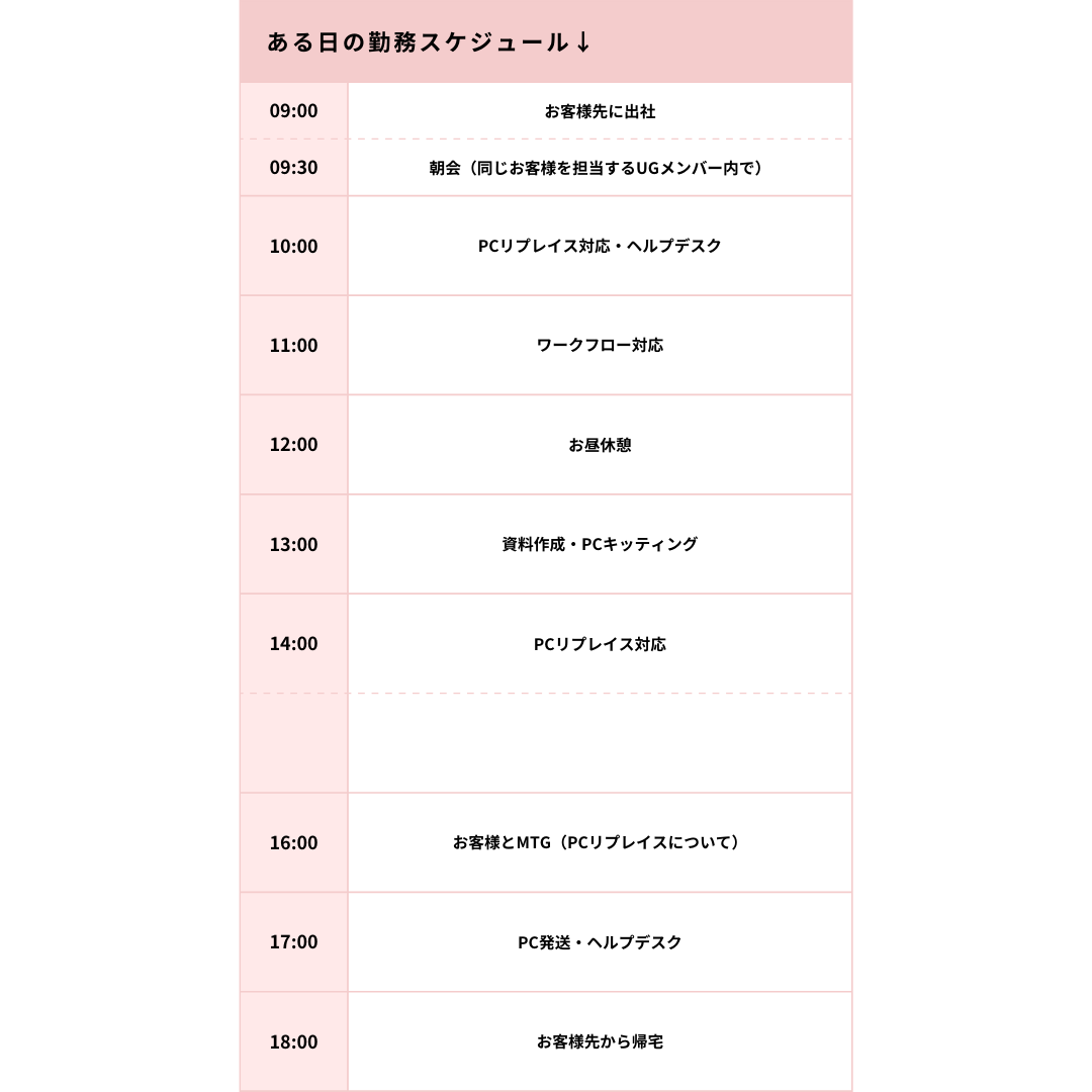 お客様とのコミュニケーションで大事にしていることは、「結果を数字で残すこと」ですね。コーポレートエンジニアは、自分のがんばりを言葉で表そうと思っても伝わりにくい仕事です。数字にすれば、目に見える成果としてお客様も理解しやすいんじゃないかなと思って、できるだけ数字を使って報告するようにしています。まだまだうまく報告できないのでもっとがんばらないといけないですけどね!何を報告するかは、お客様先の担当者の方と話すことで自分で考えました。話していくうちに、相手が何をこちらに求めているのかが見抜けるようになってきたこともUGに入ってから身についたスキルの1つかなと思います。